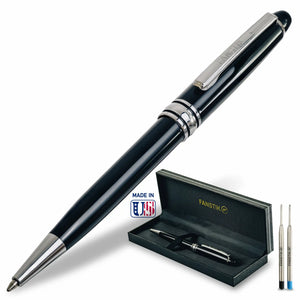 - Features: Twist mechanism. Made of stainless steel. Includes a presentation box. Contains quick-drying black ink. Easy to replace refill.